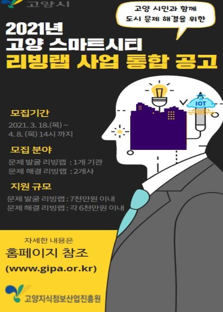 고양시와 고양지식정보산업진흥원은 시민과 함께 고양시 도시 문제를 발굴하고 첨단 ICT(정보통신기술) 기술을 적용하여 발굴된 문제 해결이 가능한 수행기관(기업)을 모집한다.