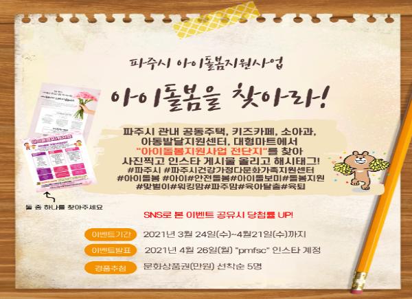 아이돌봄지원사업 ‘아이돌봄을 찾아라!’ 이벤트는 파주시 지역 내 공동주택, 키즈카페, 소아과, 대형마트 등에서 ‘아이돌봄지원사업 홍보 전단지’를 찾아 사진을 찍어 자신의 인스타그램에 해시태그를 달아 게시물을 올리면, 선착순으로 문화상품권을 받을 수 있는 이벤트다.