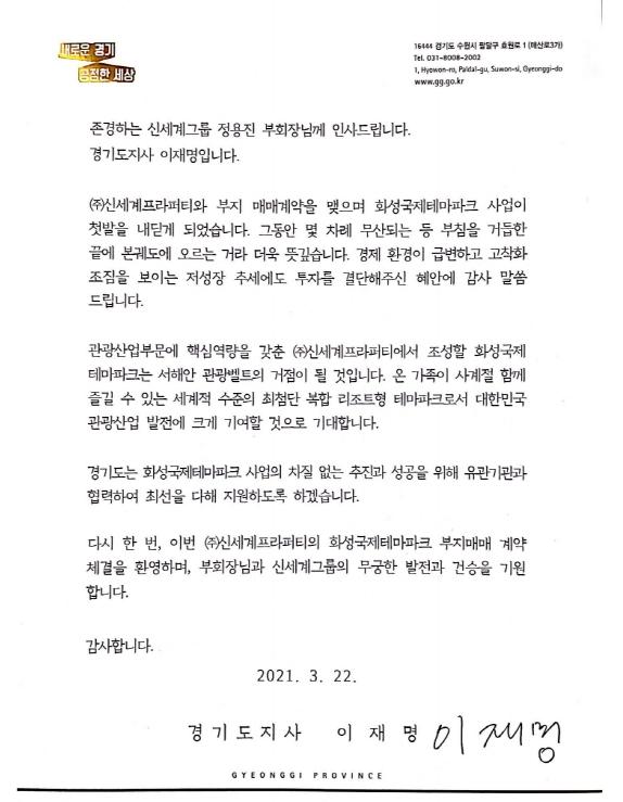 이재명 경기도지사가 지난 19일 한국수자원공사(K-water)와 ㈜신세계화성이 화성국제테마파크 건설을 위한 토지공급계약을 체결한 것과 관련해 신세계그룹 측에 감사 편지를 보냈다.