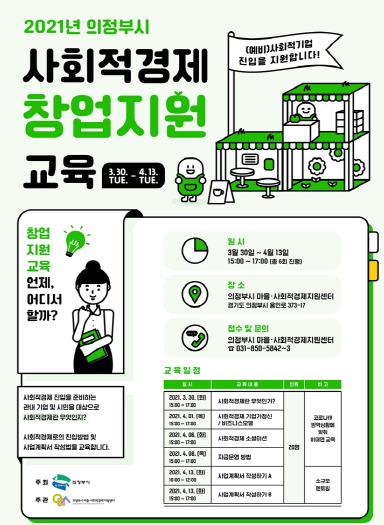 의정부시 마을·사회적경제 지원센터는 3월 18일부터 3월 29일까지 의정부시 사회적경제 창업지원 교육 수강생을 모집한다.
