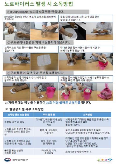 도는 ▲노로바이러스 2차 감염 대부분이 물·식품보다는 비말, 접촉으로 발생하는 점 ▲유증상자가 집단생활을 하면 소량의 바이러스로도 많은 사람들에게 감염을 일으킬 수 있는 점 ▲5세 미만의 어린이, 면역 저하자 등에게는 심각한 탈수 증상이 생길 수 있다는 점 등을 들어 환자 발생시 증상 소실 후 48~72시간까지 집단생활을 피하고 가정에서도 따로 생활할 것을 권고했다.