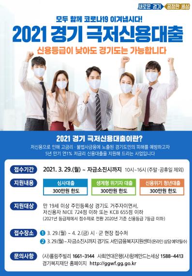 경기도가 생계가 어려운 저신용자에게 긴급 생계자금을 지원하는 '2021년 경기 극저신용대출’ 신청 접수를 29일부터 시작한다.