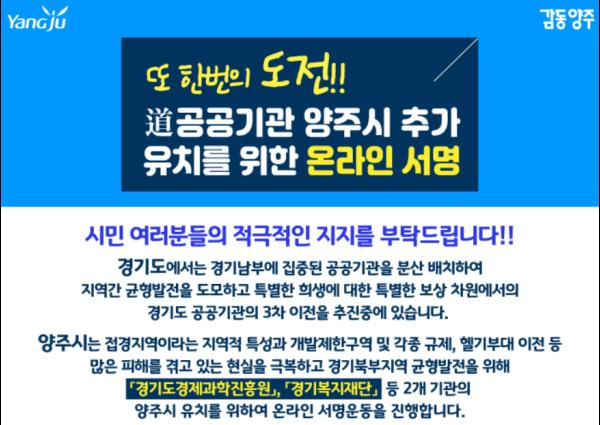 양주시는 지난 23일부터 경기도 공공기관 3차 이전계획에 따른 경기도경제과학진흥원, 경기복지재단 등의 성공적인 유치를 위한 온라인 서명 운동에 돌입했다.