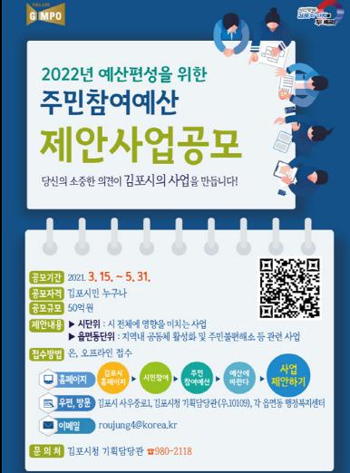 김포시는 3월 15일부터 5월 31일까지 2021년 주민참여예산 제안사업 공모 중이다.