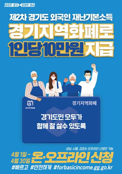 경기도가 오는 4월 1일부터 1달 간 도내 거주 외국인을 대상으로 내국인과 동일하게 1인당 10만원씩 경기지역화폐로 ‘제2차 경기도 재난기본소득’을 지급한다고 24일 밝혔다.