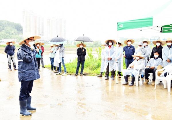모내기 시연회에는 최종환 파주시장과 국회의원, 파주시의원, 유관기관단체장 및 농업인단체 등 30여 명이 참여했다. 특히 코로나19로 어려운 여건 속에서도 파주시 최고품질 한수위쌀 생산을 위해 노력하고 있는 농업인을 격려하고 직접 이앙기에 탑승해 모내기 시연했다.