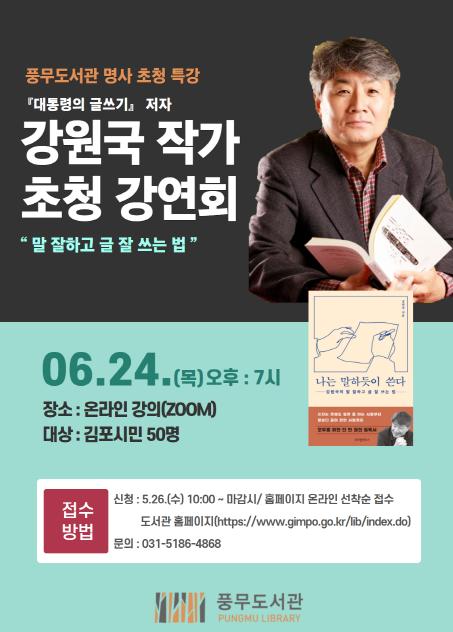 김포시 풍무도서관은 오는 6월 24일에 전 청와대 연설비서관으로 잘 알려진 강원국 작가를 초청하여 '말 잘하고 글 잘 쓰는 법'에 대한 강연을 진행한다.