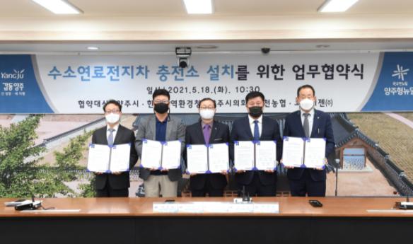 양주시는 18일 시청 상황실에서 한강유역환경청, 양주시의회, 회천농업협동조합, 코하이젠 주식회사와 손잡고 경기북부 최초로 ‘수소연료전지차 충전소 설치를 위한 업무협약’을 체결했다고 밝혔다.
