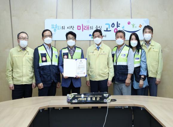 시상식은 코로나19 상황을 고려해 지난 17일 고양시청에서 이재준 고양시장, 김천만 고양시 시민안전지킴이 연합대장 등 최소 인원만 참석해 진행됐다.