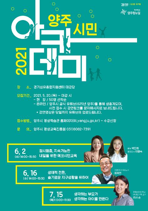 양주시는 오는 6월 2일, 6월 16일, 7월 15일 3일에 걸쳐 경기섬유종합지원센터 대강당에서 ‘2021년 양주시민 아카데미’를 개최한다.