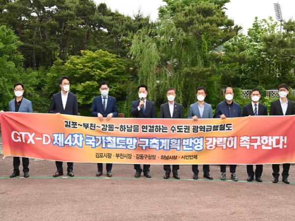 이번 행사는 지난 4월 22일 국토부가 발표한 제4차 국가철도망구축계획(안)에서 경기도 부천시·김포시·하남시와 강동구가 건의한 GTX-D 원안노선 미반영에 따라 GTX-D 노선의 원안고수에 대한 관련 지자체의 입장을 전달하고 도입 필요성을 강조하기 위해 이뤄졌다.