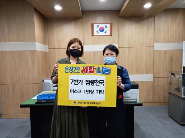 파주시 운정2동은 지난 21일 7번가짬뽕천국이 운정행복센터를 방문해 사랑의 마스크 1만장을 기탁했다고 밝혔다.