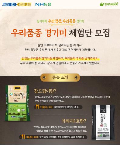 경기도농업기술원이 자체 개발한 신품종 쌀 ‘참드림, 가와지1호’의 소비를 촉진하기 위해 ‘우리품종 경기미’ 체험단을 모집한다.