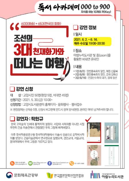고양시 아람누리도서관은 오는 6월 2일부터 예술 주제 강연 ‘조선의 3대 천재화가와 떠나는 여행’을 운영한다.