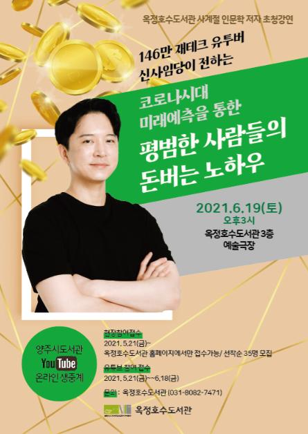 양주시 옥정호수도서관은 오는 6월 19일 146만 인기 경제 유튜버인 재테크 전문 크리에이터 신사임당을 초청해 사계절 인문학 강연회를 개최한다.