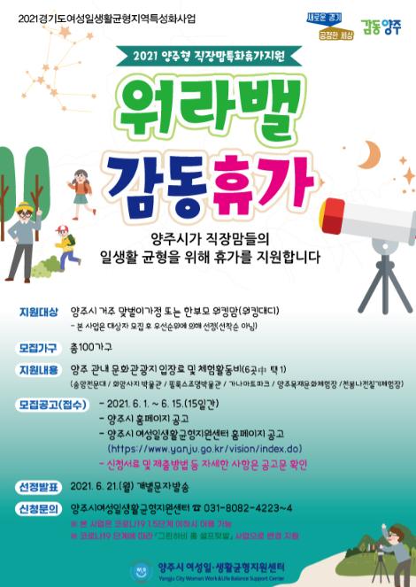 양주시 여성일생활균형지원센터는 오는 6월 1일부터 15일까지 2021년 양주형 직장맘 특화 휴가지원 사업인 ‘워라밸 감동휴가’에 참여할 맞벌이 직장맘, 일하는 한부모 가정을 모집한다.