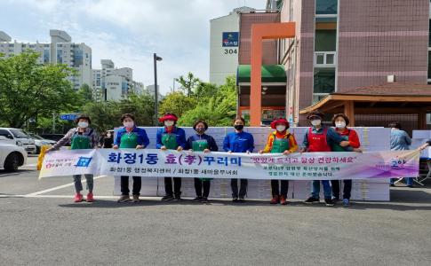 이번 행사는 코로나19로 인해 열리지 못한 경로잔치를 대신해 진행됐으며, 화정1동새마을부녀회 주관으로 통장협의회, 주민자치위원회, 관리사무소 등의 도움을 받아 각 통 통장들이 어르신 댁에 직접 ‘효(孝) 꾸러미’를 전달했다.