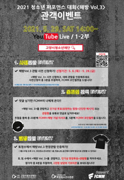 참가자와 관람객을 위한 다양한 이벤트도 진행된다. 먼저, 5월 29일(토) 대회 당일부터 6월 12일(토)까지 유튜브 댓글 투표를 진행하여, 본선 참가자 중 총 3팀에게 인기상을 시상한다. 관람객들의 활발한 참여와 응원으로 인기상을 선정할 수 있다. 대회 진행 당일 유튜브 댓글로 인기상 투표 또는 관람평을 작성하는 관람객에게는 추첨을 통해 FCMM에서 제작한 ‘해방vol.3 기념티셔츠’ 또는 코인월렛을 선물할 예정이다. 또한 사전에 온라인 관람을 신청하면 신청자 중 추첨을 통해 FCMM 코인월렛을 증정하는 사전신청 이벤트까지 진행한다.
