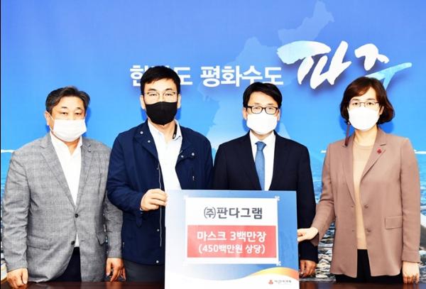 파주시는 지난 2일 ㈜판다그램(대표 안병철)이 4억 5,000만 원 상당의 마스크 300만장을 기탁했다고 밝혔다.