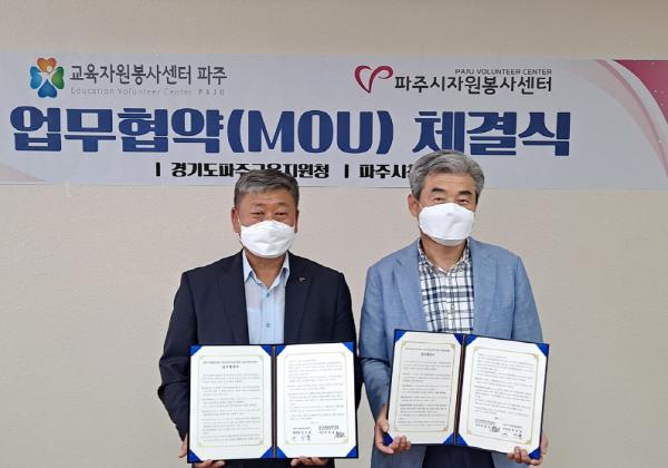 이날 파주교육지원청 교육자원봉사센터(센터장 윤송근)와 파주시자원봉사센터(센터장 연진흠)는 코로나19 감염 예방을 위하여 최소 인원만 참석한 가운데 지역교육자원 발굴 및 인력풀 공유 등 교육자원봉사 활성화를 위한 지속적인 상호 협력을 약속하였다.
