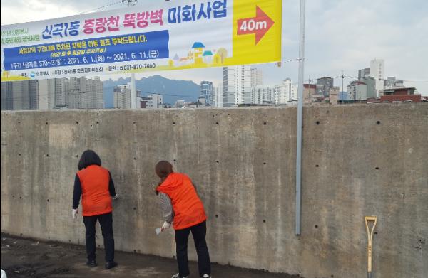 의정부시 신곡1동 주민자치위원회는 6월 1일부터 신곡1동 중랑천 제방 벽화 조성 작업을 시작했다. 이번 벽화조성 활동은 의정부시에서 실시하는 ‘마을공동체 주민제안 공모사업’의 일환으로, 신곡1동 통장협의회의 협조와 동참하에 6월 한 달간 중랑천 제방 벽화 조성 및 주변 환경 미화 활동을 할 예정이다.