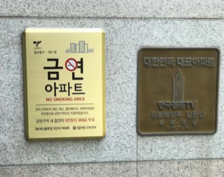 ‘국민건강증진법’에 의해 거주 세대 2분의 1 이상이 공동주택의 복도, 계단, 엘리베이터, 지하주차장의 전부 또는 일부를 금연구역으로 지정 동의하고 관할 보건소에 신청하면 금연아파트로 지정할 수 있다.