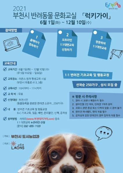 부천시는 체계적인 반려동물 교육을 통한 올바른 반려동물 문화 정착을 위해 반려동물 문화교실 ‘럭키가이’를 운영한다고 4일 밝혔다.