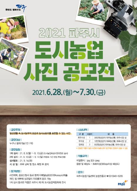 파주시는 도시농업 스토리를 표현할 수 있는 장을 마련하고 시민소통과 참여를 유도해 도시농업 활성화의 계기를 마련하기 위해 ‘2021 파주시 도시농업 사진 공모전’을 개최한다.
