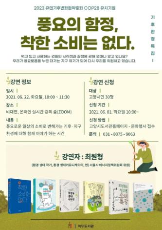고양시 마두도서관은 2023년 ‘유엔기후변화협약 당사국총회(COP28)’ 고양시 유치를 기원하는 ‘기후 ․ 환경 특집 프로그램’을 오는 22일, 24일 두 차례 운영한다.