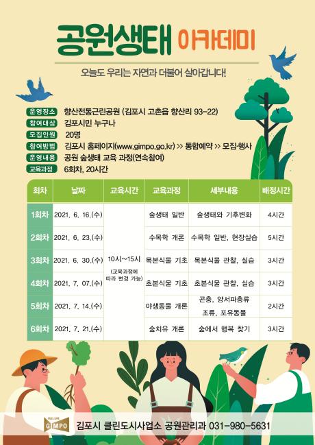 공원 숲생태 교육은 “공원 숲생태 아카데미” 과정으로 숲생태 일반에서부터 수목학, 목본식물, 초본식물, 야생동물, 숲치유 개론까지 접할 수 있고, 6회에 걸쳐 진행되며 총20시간으로 편성되었다. 고촌 향산리 향산전통근린공원에서 6월 16일부터 매주 수요일 10시~15시까지며 전회 참여하면 교육수료증도 받을 수 있다.