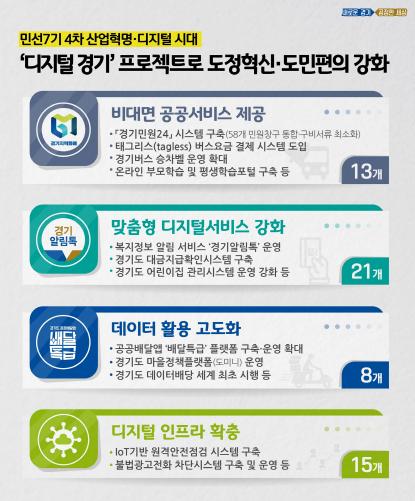 경기도는 현재 ▲공공비대면 서비스제공 ▲맞춤형 디지털 서비스 강화 ▲데이터 활용 고도화 ▲디지털 인프라 확충 등 4대 부문 57개의 디지털 도정 사업을 추진 중이다. 앞으로 도가 펼쳐갈 디지털 정책은 어떤 것들이 있는지 부문별로 추진하고 있는 대표적인 사업을 살펴봤다.
