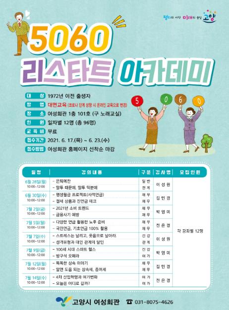 고양시 여성회관은 5060세대의 노후 대비를 위한 자산관리 프로그램 ‘5060 리스타트 아카데미’ 수강생을 17일부터 모집한다.