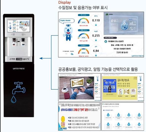스마트 수돗물 음수기는 음수기 내부에 설치된 수질측정기에서 탁도, 잔류염소, pH, 전기전도도 등의 실시간으로 측정된 수질 결과가 음수기 모니터를 통해 음용 시 직접 확인가능하고, 휴일·야간등 미사용 시에는 자동배수 및 건조를 통한 위생적 관리로 언제나 신선한 수돗물을 마실 수 있도록 제공하는 시스템이다.