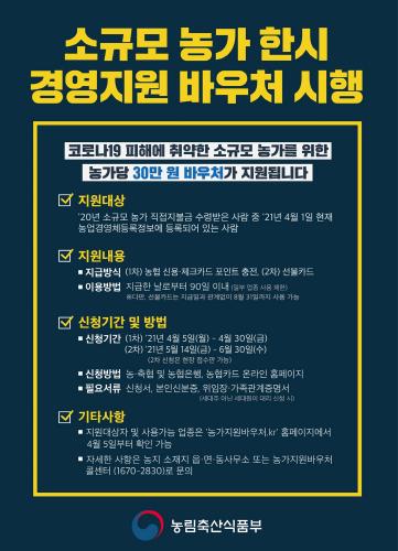 지원대상은 ‘2020년 소규모 농가 직접지불금을 수령받은 사람 중 2021년 4월 1일 현재 농업경영체등록정보에 등록되어 있는 사람’으로 2차 신청기간(5월 14일~6월 30일)에는 농가당 30만 원의 바우처가 선불카드 형식으로 지급되며 8월 31일까지 사용이 가능하고 사용기간 경과 후 남은 잔액은 소멸된다.