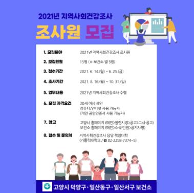 고양시 일산동구보건소는 오는 14일부터 25일까지 ‘2021년 지역사회건강조사’를 수행할 조사원 5명을 모집한다.