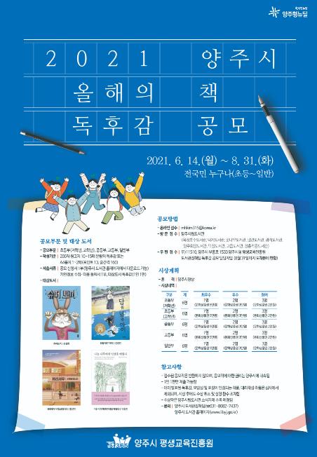 양주시는 오는 14일부터 8월 31일까지 2021 양주 올해의 책을 대상으로 독후감 공모전을 개최한다.