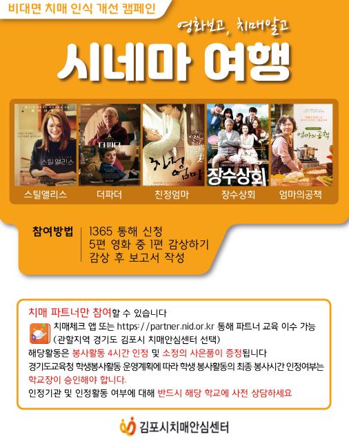 김포시 치매안심센터는 관내 치매파트너를 대상으로 비대면 치매 인식개선 캠페인 '영화보고, 치매알고 시네마 여행'을 진행한다.