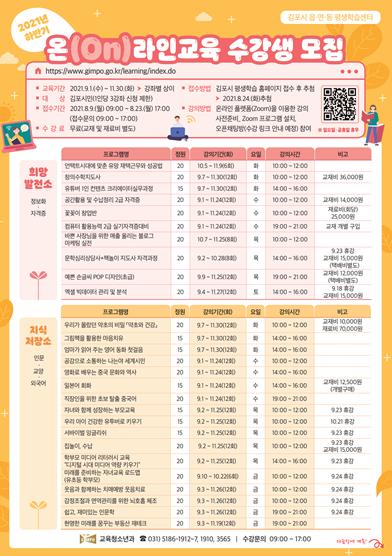 김포시 읍·면·동 평생학습센터는 시민의 평생교육 활성화를 위해 2021년 하반기 온라인교육 수강생을 모집한다.