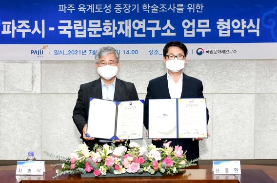 파주시는 지난 7월 30일 시청 비즈니스룸에서 문화재청 국립문화재연구소(소장 지병목)와 ‘파주 육계토성 중장기 학술조사를 위한 업무협약’을 맺었다.
