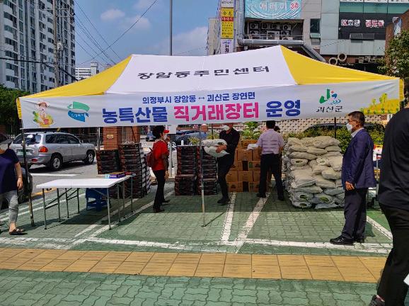 의정부시 장암동은 주민자치위원회(위원장 박범서) 주관으로 7월 30일 주민센터 주차장에서 자매결연지 괴산군 장연면에서 생산되어 직배송한 농산물 직거래 장터를 개최했다.