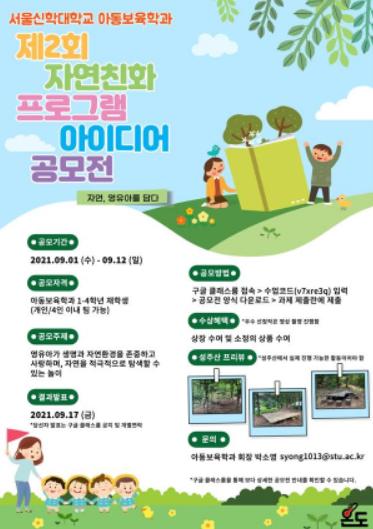 부천시 서울신학대학교 아동보육학과에서 주최하는 '제2회 자연친화 프로그램 아이디어 공모전'이 오는 9월 1일부터 9월 12일까지 실시된다.