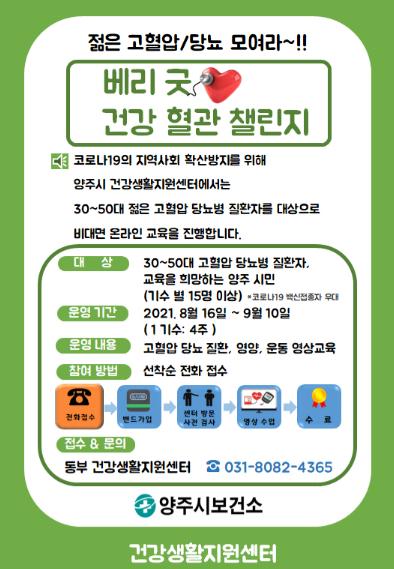 양주시는 ‘양주 On-Health’ 사업의 일환으로 온라인 심뇌혈관질환 예방관리사업 ‘베리굿 건강혈관챌린지’ 참여자(동부 2기, 서부 1기)를 모집한다.