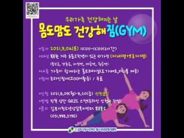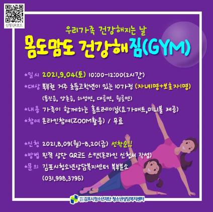 ‘몸도맘도 건강해짐(GYM)’이라는 주제로 9월 4일 운영되는 이번 프로그램에서는 인터넷스마트폰 과의존으로 거북목, 굽은 어깨, 등교정에 도움이 되는 스트레칭과 가족이 함께하는 커플동작을 배울 수 있어 청소년의 자세교정과 부모자녀 관계개선에 도움이 될 것으로 기대된다.