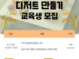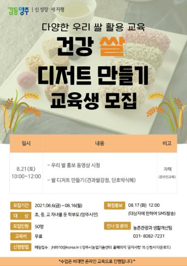 양주시는 오는 16일까지 다양한 가공품으로 활용 가능한 우리쌀의 소비 기반을 조성하기 위해 건강 쌀 디저트 만들기 교육 수강생을 모집한다.