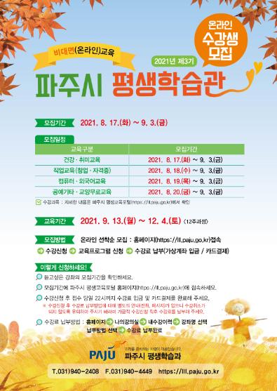 파주시 평생학습관은 오는 8월 17일부터 9월 3일까지 2021년 제3기 온라인 강좌 수강생 1,730명을 모집한다.