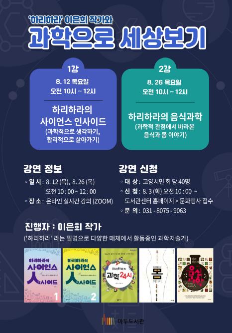 고양시 마두도서관에서 필명 ‘하리하라’로 잘 알려진 이은희 작가와 ‘과학으로 세상보기’제목으로 2회에 걸쳐 강연을 진행한다.
