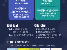 8월 12일 첫 번째 강연에서는 작가의 최근 저서 '하리하라의 사이언스 인사이드'를 바탕으로, 세상을 과학적으로 바라본다는 의미와 과학적 사고방식이 바꿀 수 있는 삶의 모습을 살펴보고, 과학적 사고방식을 일상에 적용하는 방법을 알아본다.