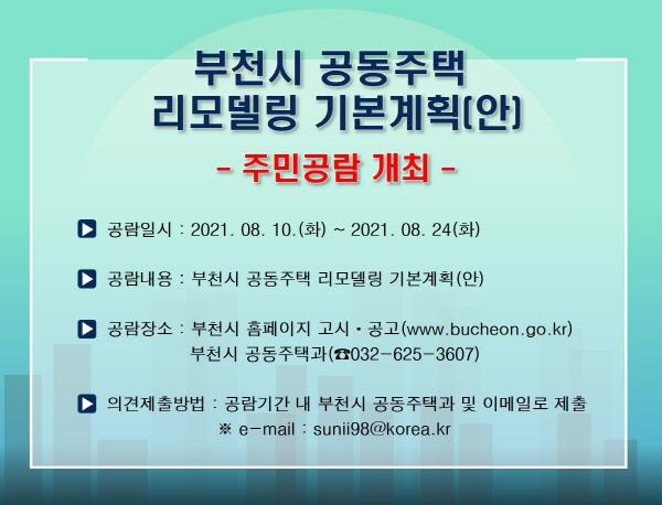 부천시는 ‘공동주택 리모델링 기본계획(안)’ 수립 용역 진행이 후반부에 이르러 주민공람을 개최한다.