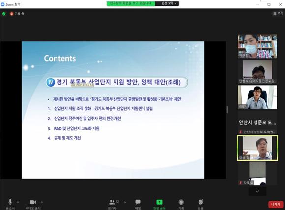 경기도의회 연구단체 「경기도의회 산업단지 활성화 포럼」(회장 김현삼 의원, 더민주, 안산7)은 8월 12일 11시에 ‘경기도 북동부 지역 산업단지 발전을 위한 정책연구’에 대한 연구용역 최종보고회를 비대면 영상회의 줌(Zoom) 방식으로 진행하였다.