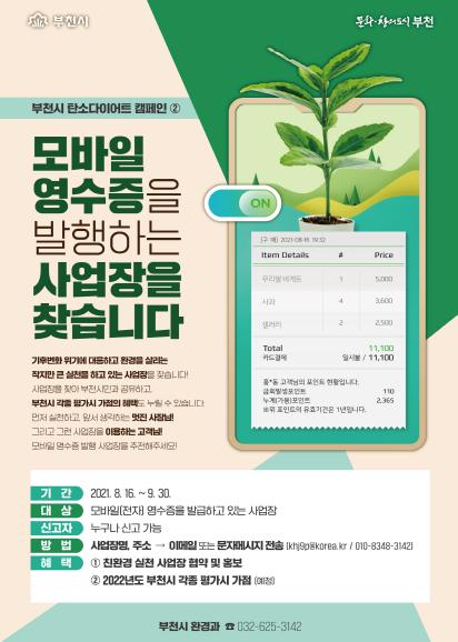 부천시는 지난 8월 4일부터 9월 30일까지 탄소 다이어트 캠페인 추진에 따라 두 번째 다이어트인‘모바일 영수증 받기’실천을 위해 모바일 영수증을 발행하는 사업장을 모집한다.
